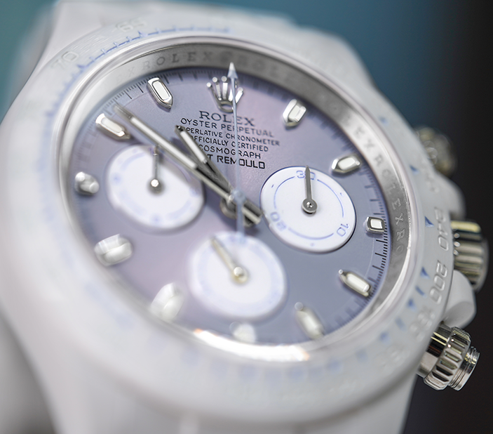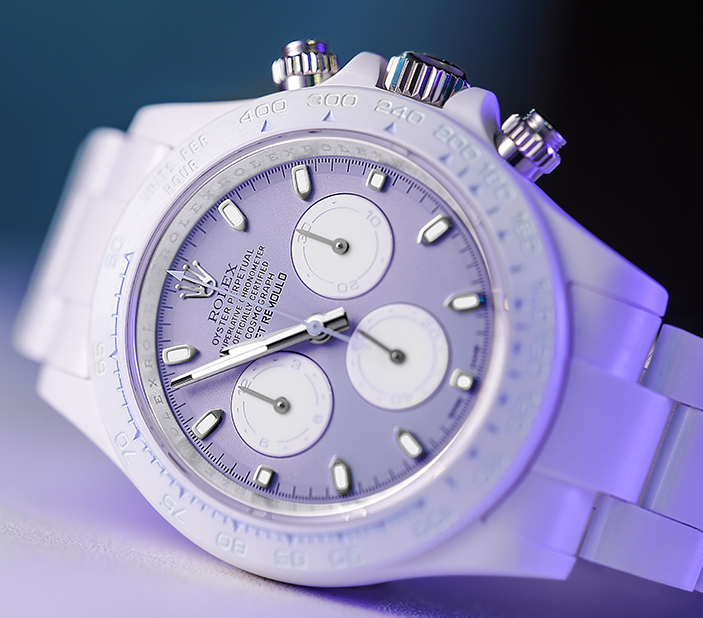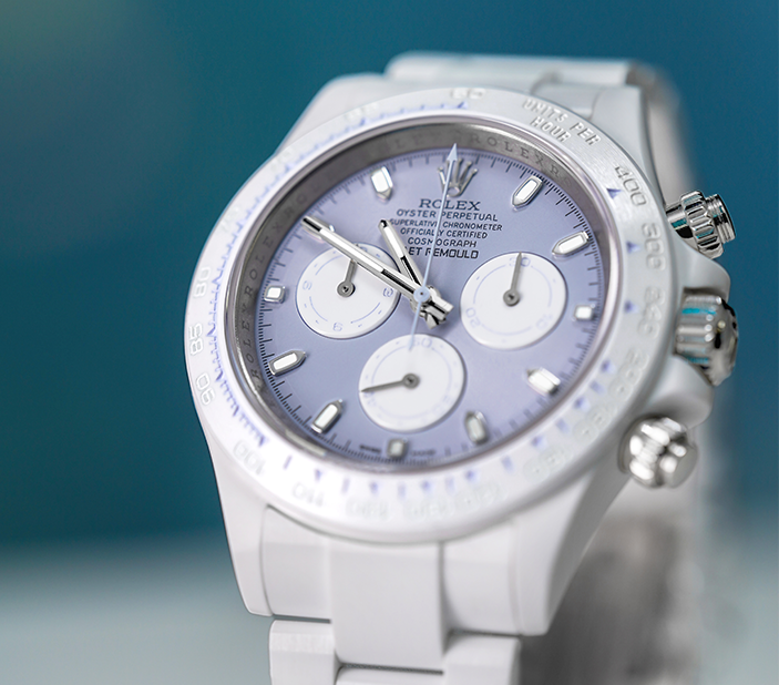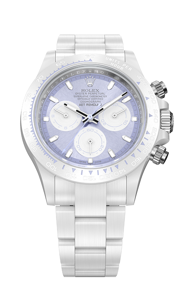 To precisely control both form and color, AET REMOULD has comprehensively refined its HTP ceramic process. Under pressures of approximately 2,000 bar and sintering temperatures of 1,500°C, the ceramic is compressed into a dense structure before being shaped with diamond tools and six-axis CNC machining into a complex case architecture. An in-house plasma coloring technique ensures tonal purity and balance, while laser engraving combined with hand finishing, brushing, and chamfer polishing imparts HTP ceramic with its distinctive depth of light and smooth touch.
