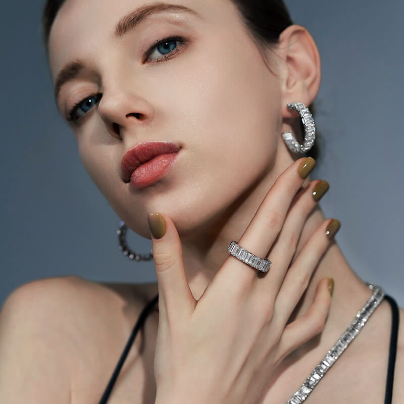 高品质的18K白金表面经过精细抛光,呈现光滑而闪亮的视觉效果,不仅增强了整体美感,更为产品赋予卓越的耐久性。其柔美而高雅的外观,即使历经岁月的洗礼,仍能熠熠生辉。