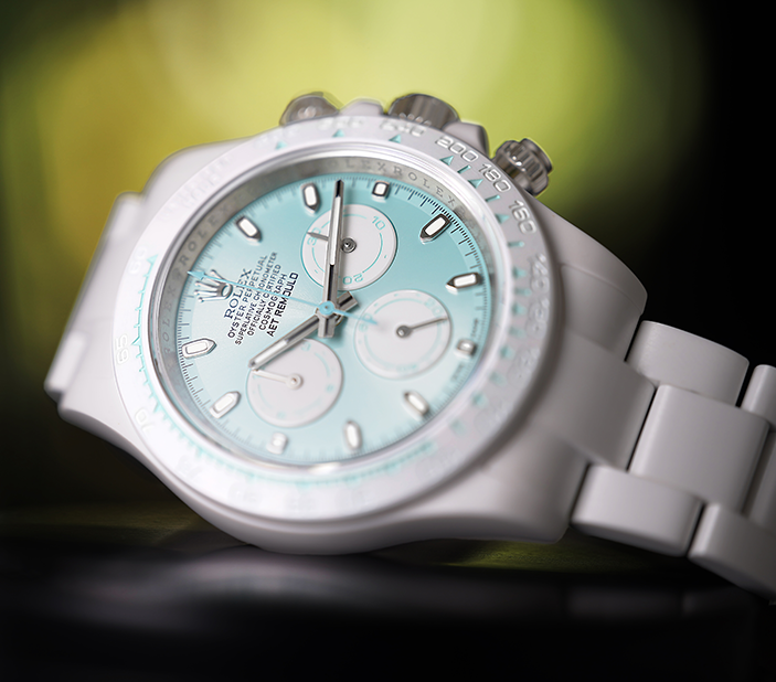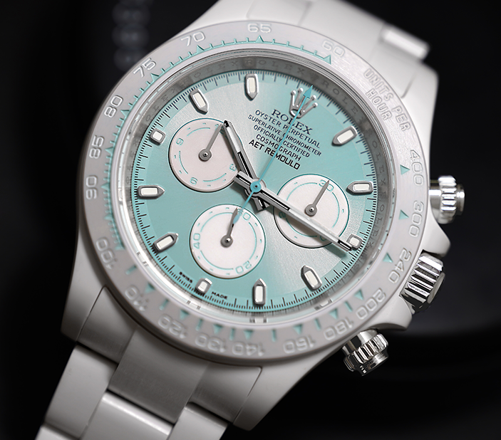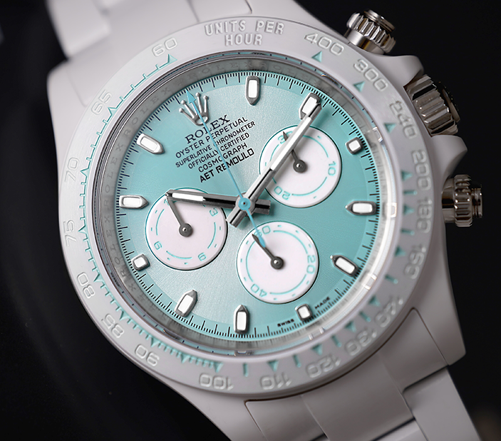 To precisely control both form and color, AET REMOULD has comprehensively refined its HTP ceramic process. Under pressures of approximately 2,000 bar and sintering temperatures of 1,500°C, the ceramic is compressed into a dense structure before being shaped with diamond tools and six-axis CNC machining into a complex case architecture. An in-house plasma coloring technique ensures tonal purity and balance, while laser engraving combined with hand finishing, brushing, and chamfer polishing imparts HTP ceramic with its distinctive depth of light and smooth touch.