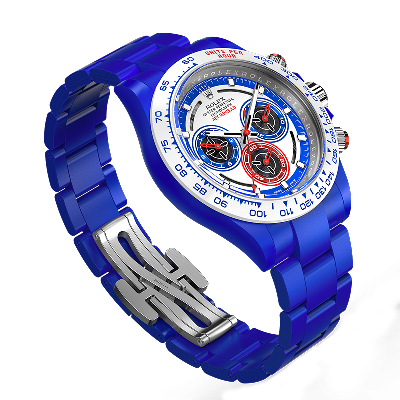白色陶瓷表圈搭配蓝色测速刻度,延续了表盘的主调色彩逻辑,在提供实用计时功能的同时,也成为整表美学中不可或缺的一环。计时按钮上的红色点缀尤为巧妙,犹如赛车“点火”与“加速”的经典联想,在视觉上提供极具辨识度的操控符号。