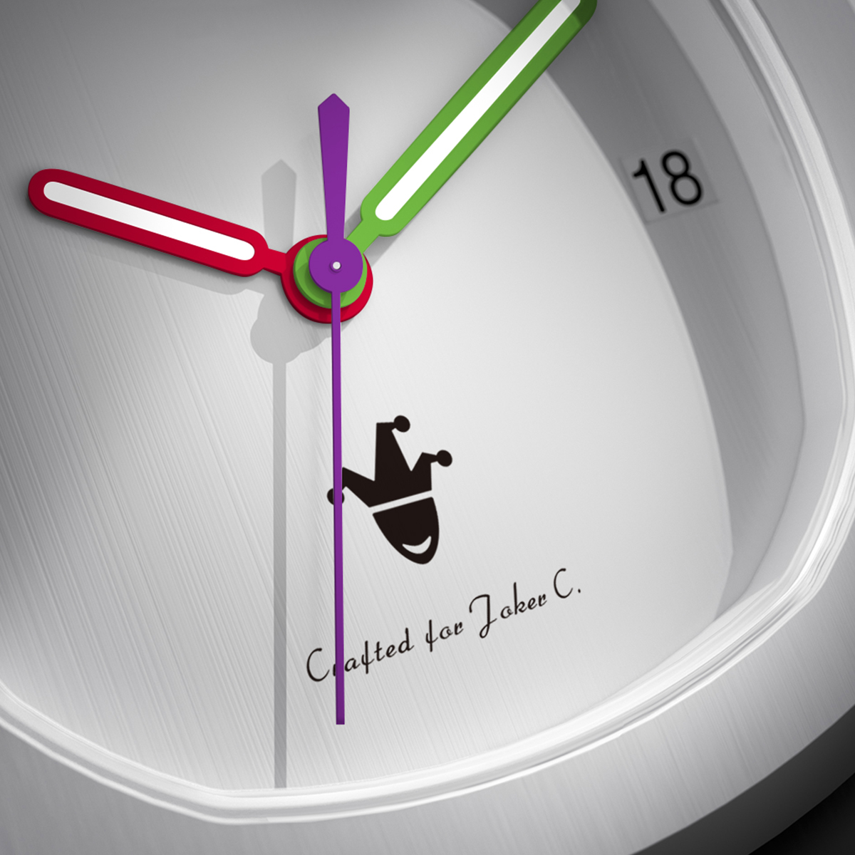 我们的设计团队与客户进行了紧密交流,深入了解他对小丑主题的独特见解。客户要求表盘呈现出小丑的形象,风格偏向可爱,且希望将红、绿、紫作为指针的颜色,以及在表盘上加入专属签名。